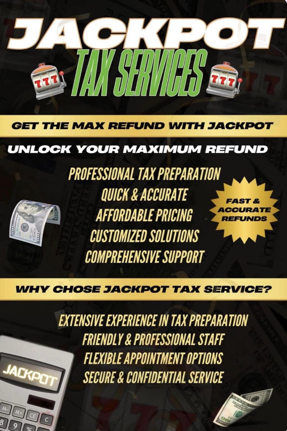 At JackPot, we pride ourselves on delivering exceptional tax preparation and planning services tailored to meet the unique needs of each client. With years of expertise and a commitment to precision, we ensure our clients navigate their financial landscape with confidence and clarity.